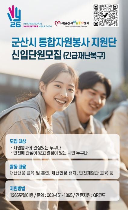 [충청뉴스큐] 군산시자원봉사센터는 각종 자연 사회 재난 발생 시 신속하고 체계적인 현장 지원을 위해 ‘통합자원봉사지원단’을 오는 4월 26일까지 모집한다고 밝혔다.