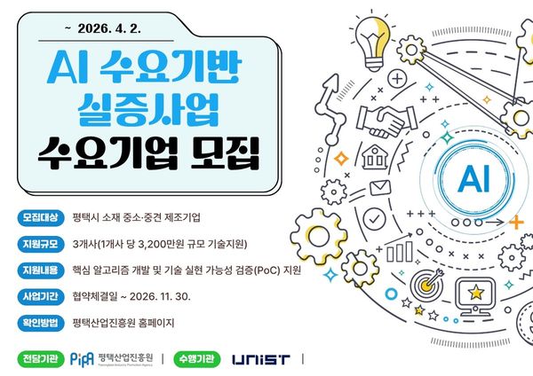 이번 ‘AI 수요기반 실증사업’의 상세 공고 내용과 신청 양식은 평택산업진흥원 누리집 및 평택기업지원시스템에서 확인할 수 있으며, 신청 접수는 4월 2일까지 진행된다.