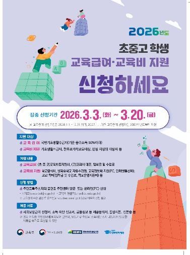 [충청뉴스큐] 아산시는 저소득 가구 학생의 교육기회 보장을 위해 2026년 교육급여 및 초 중 고 교육비 지원사업 집중 신청기간을 3월 3일부터 3월 20일까지 운영한다.