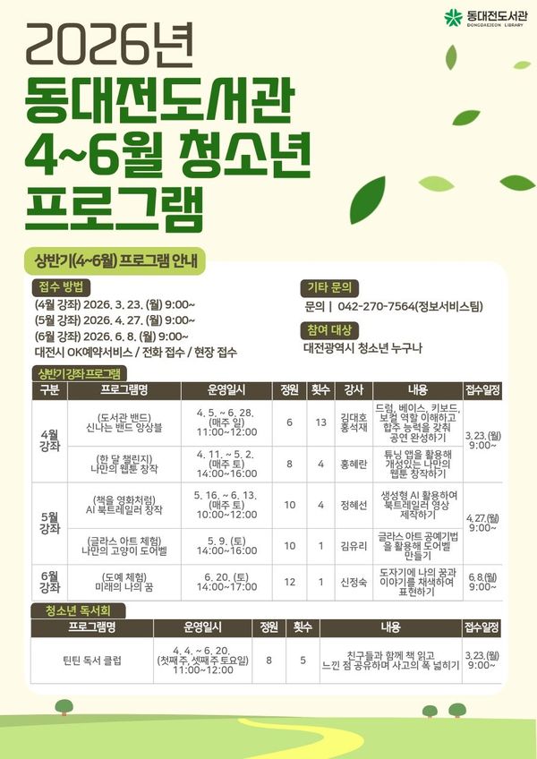 [충청뉴스큐] 동대전도서관은 봄을 맞아 오는 4월 5일부터 6월 20일까지 청소년을 대상으로 다양한 독서 문화 프로그램을 운영한다.
