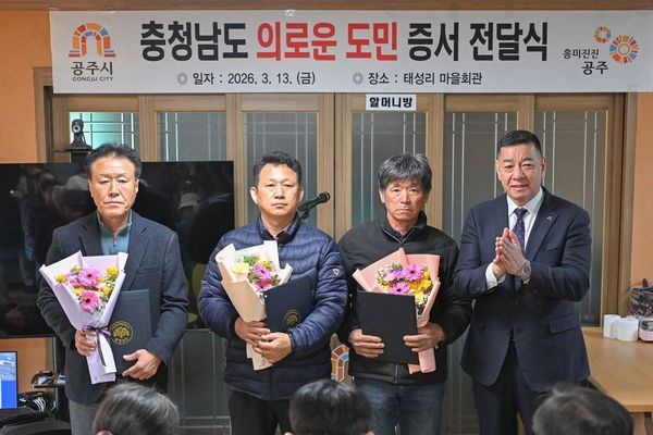[충청뉴스큐] 공주시는 지난 13일 정안면 태성리 마을회관에서 공동체 안전을 위해 헌신적인 행동을 보인 시민 3명에게 ‘충청남도 의로운 도민 증서’를 전달했다.