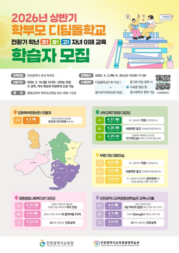 [충청뉴스큐] 인천광역시교육청평생학습관은 16일부터 전환기 학년인 초1, 중1, 고1 자녀를 둔 학부모를 대상으로 ‘2026년 상반기 학부모 디딤돌학교’를 모집한다.