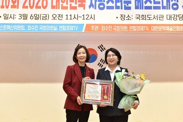 [충청뉴스큐] 경기도의회 교육행정위원회 이서영 도의원은 6일 국회도서관 대강당에서 열린 '제10회 2026 대한민국 자랑스러운 베스트대상 시상식'에서 의회의정공헌대상을 수상했다.
