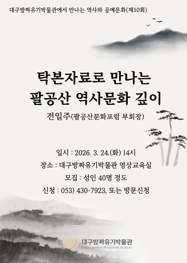 [충청뉴스큐] 대구문화예술진흥원 박물관운영본부 소속 대구방짜유기박물관은 봄날에 팔공산 역사문화 특강과 국악 공연을 기획해 3월 24일 오후 2시에 ‘탁본자료로 만나는 팔공산 역사문화 깊이’를, 4월 7일 오후 1시에 대구시립국악단 찾아가는 공연 ‘봄날의 풍류’를 개최한다.