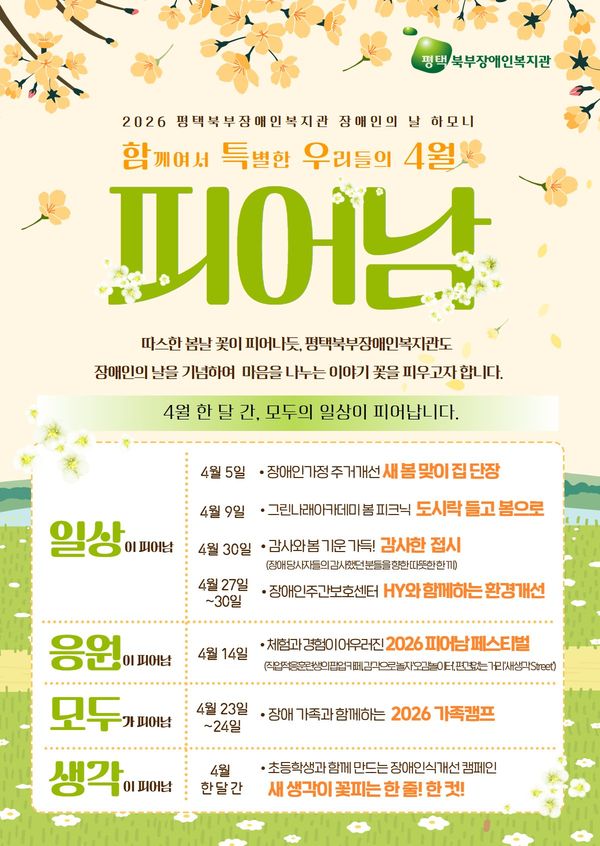 [충청뉴스큐] 평택북부장애인복지관에서는 제 46회 장애인의 날을 맞이해, 4월 한 달 간2026 장애인의 날 행사 '함께여서 특별한 우리들의 4월, 피어남 '을 진행할 예정이다.