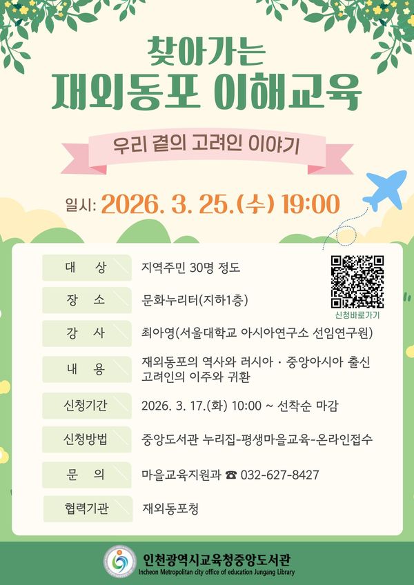 [충청뉴스큐] 인천광역시교육청중앙도서관은 오는 17일부터 찾아가는 재외동포 이해교육 ‘우리 곁의 고려인 이야기’참여자를 모집한다.