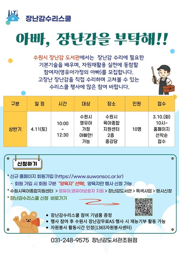 [충청뉴스큐] 수원시육아종합지원센터는 4월 11일 수원시육아종합지원센터 2층 중강당에서 영유아 가정 아빠를 대상으로 ‘장난감수리스쿨 아빠, 장난감을 부탁해’프로그램을 운영한다.