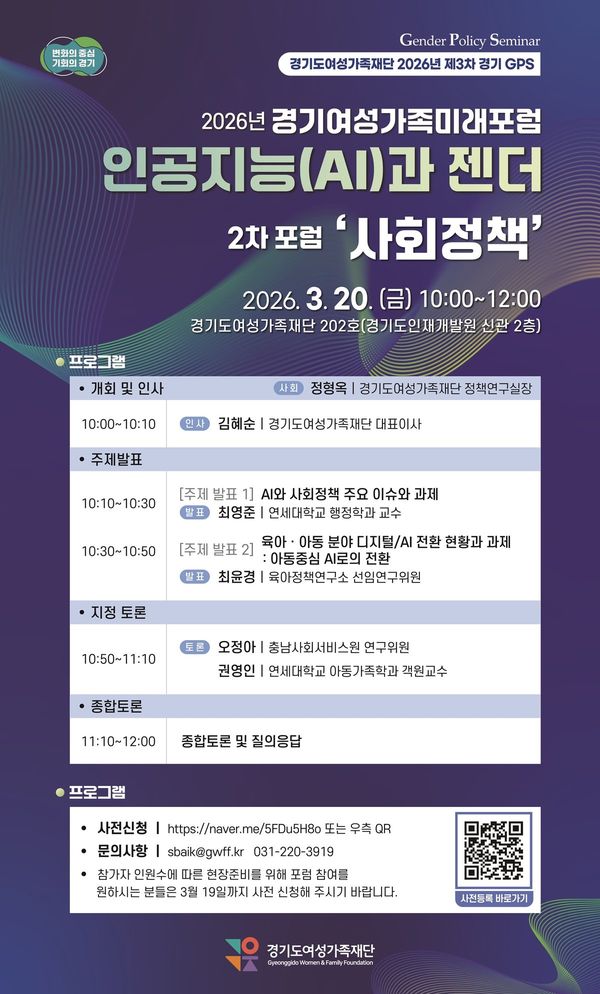 [충청뉴스큐] 경기도여성가족재단은 20일 ‘인공지능과 사회정책’을 주제로 경기여성가족미래포럼 2차 포럼을 개최한다.