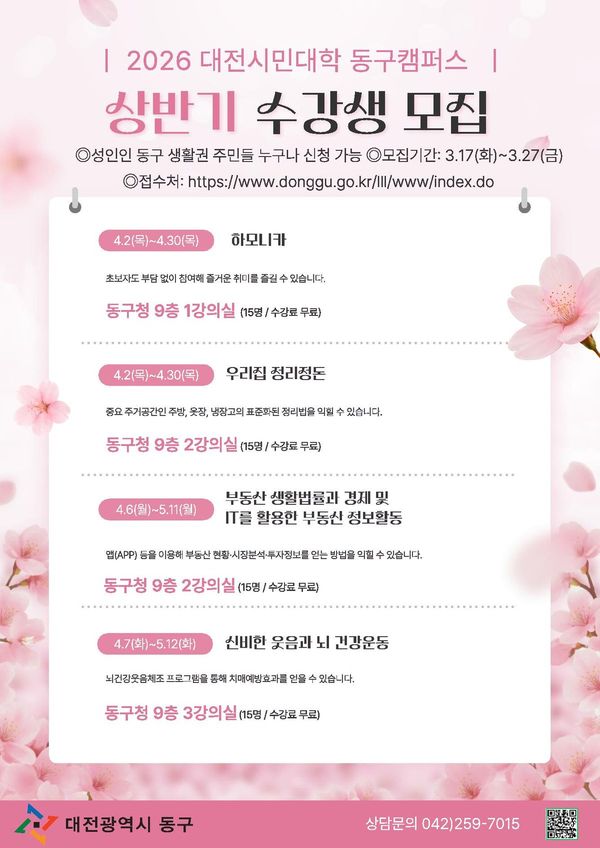 [충청뉴스큐] 대전 동구는 이달 17일부터 27일까지 '2026 상반기 대전시민대학 동구캠퍼스'수강생을 모집한다고 밝혔다.