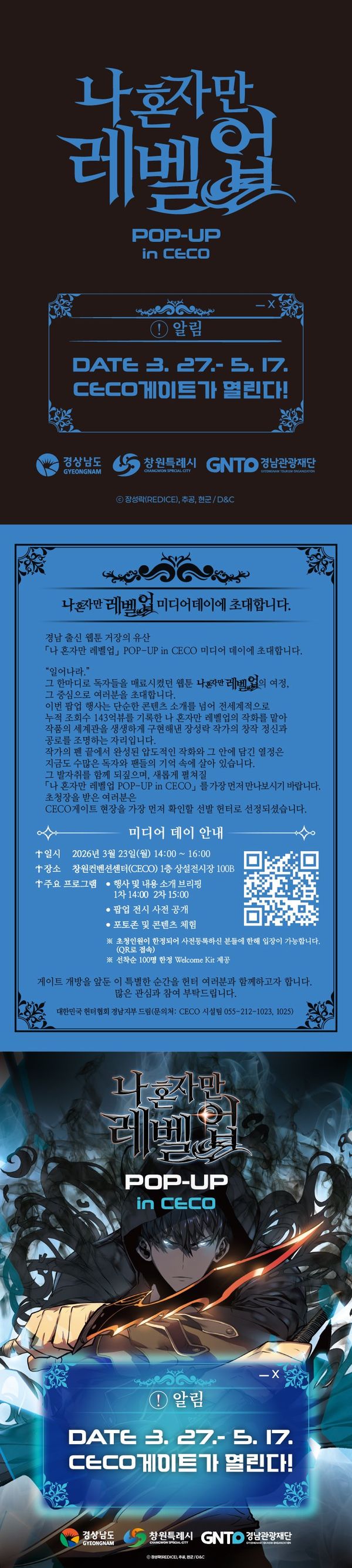 [충청뉴스큐] 글로벌 누적 조회수 143억 회를 기록하며 전 세계적인 신드롬을 일으킨 K-웹툰의 대표작 '나 혼자만 레벨업'팝업스토어가 경남에서 열린다.