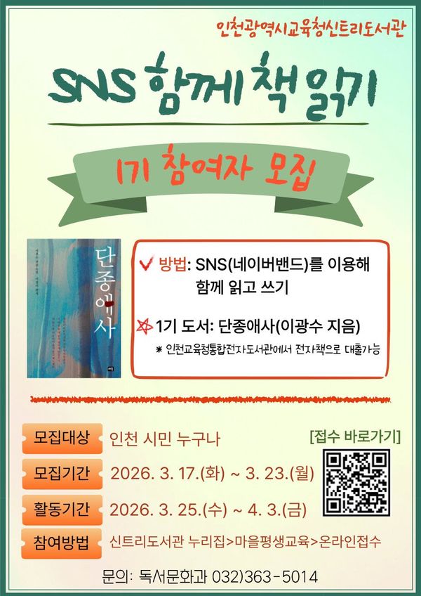 [충청뉴스큐] 인천광역시교육청신트리도서관은 인천 시민의 일상 속 독서 실천을 지원하기 위해 온라인 독서 프로그램 ‘2026년 SNS 함께 책 읽기’를 운영한다.