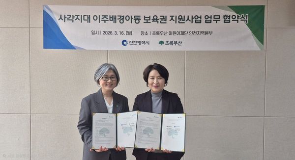 [충청뉴스큐] 인천광역시는 지난 3월 16일 아동복지전문기관 초록우산 인천지역본부와 저소득 외국인가정 영유아 돌봄 지원을 위한 "사각지대 이주배경아동 보육권 지원사업"추진 업무협약을 체결하고 사업 추진을 위한 상호 협력을 약속했다고 밝혔다.