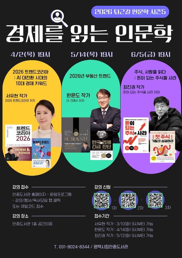 두 번째 강연은 5월 14일 오후 7시, 한문도 작가가 ‘2026년 부동산 트렌드’를 주제로 강연하며 세 번째 강연은 6월 5일 오후 7시, 최진권 작가의 ‘주식, 사람을 읽다: 돈이 되는 주식을 사라’를 주제로 시민들과 만날 예정이다.