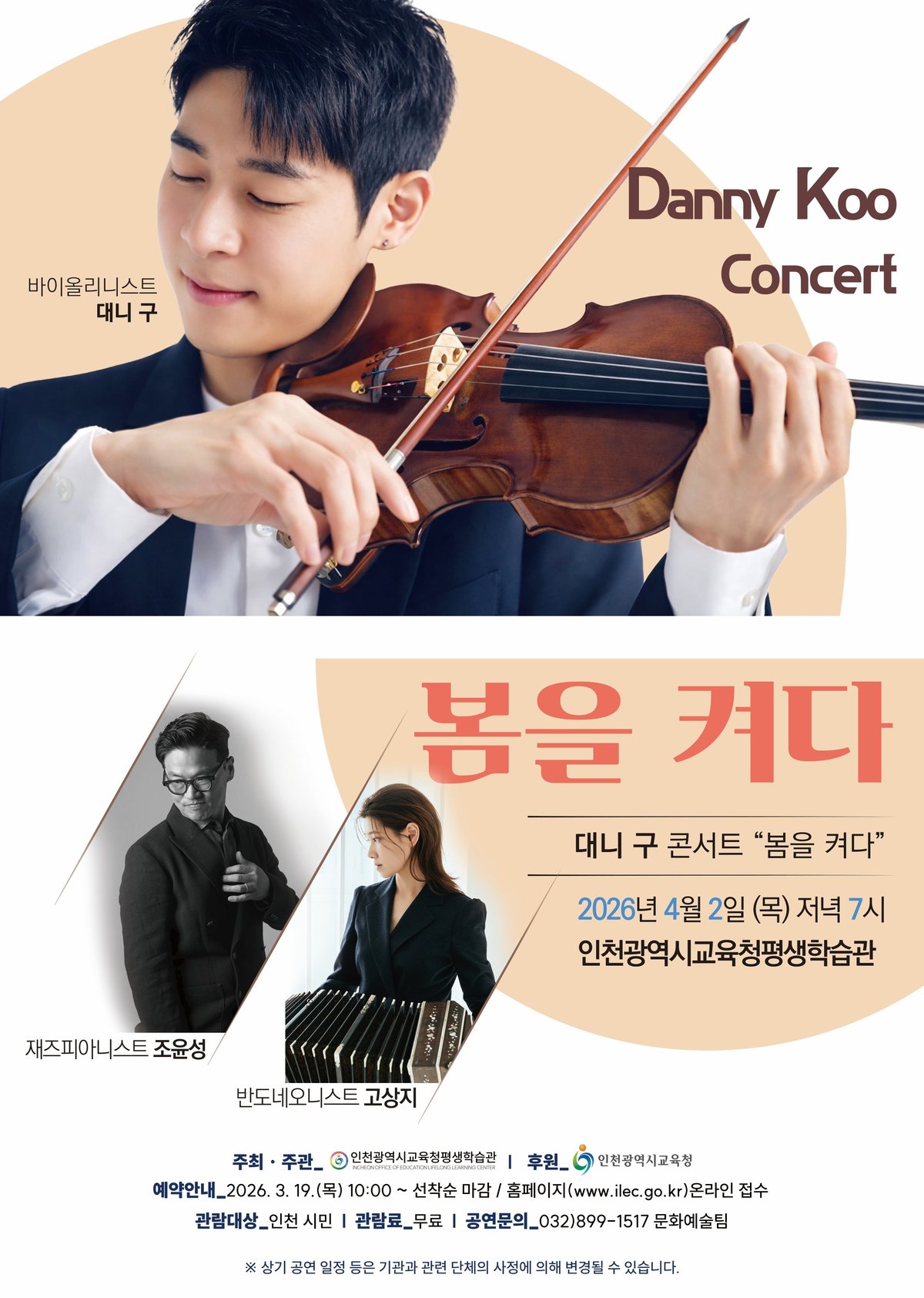 [충청뉴스큐] 인천광역시교육청평생학습관은 오는 4월 2일 교육누리홀에서 인천시민을 대상으로 ‘대니 구 콘서트, 봄을 켜다’공연을 개최한다.
