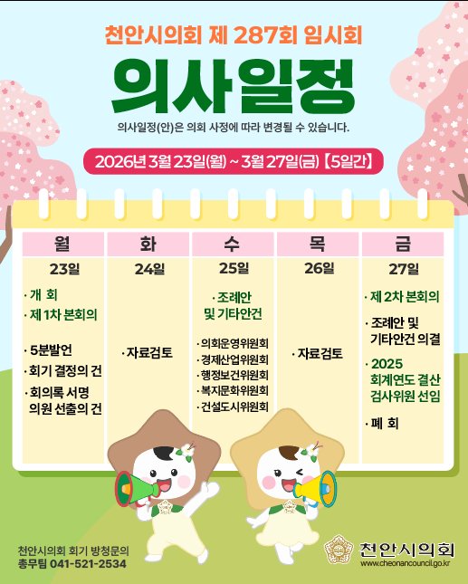 [충청뉴스큐] 천안시의회가 오는 3월 23일부터 27일까지 5일간의 일정으로 제287회 임시회를 운영한다.