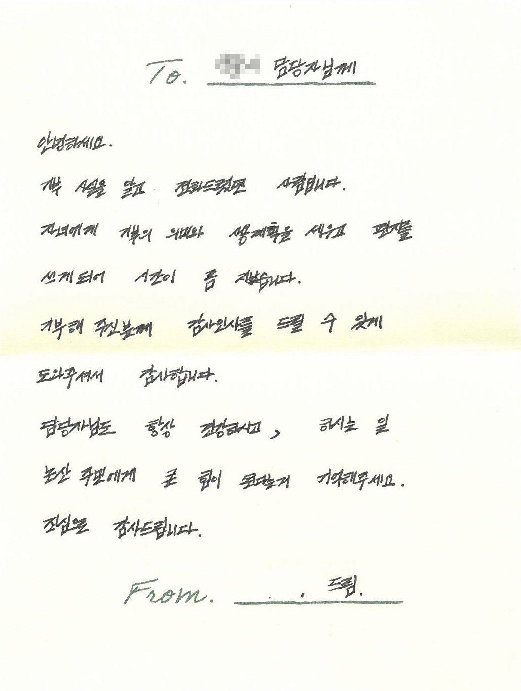 이 편지는 수년째 논산시에 고액을 기탁해 온 익명의 기부자 A씨의 후원을 받은 한 가정에서 보낸 것으로 기부자에게 전하는 엄마와 아이의 편지. 그리고 이들을 연결해 준 시청 담당 공무원에게 전하는 편지까지 총 세 통이 전달됐다.