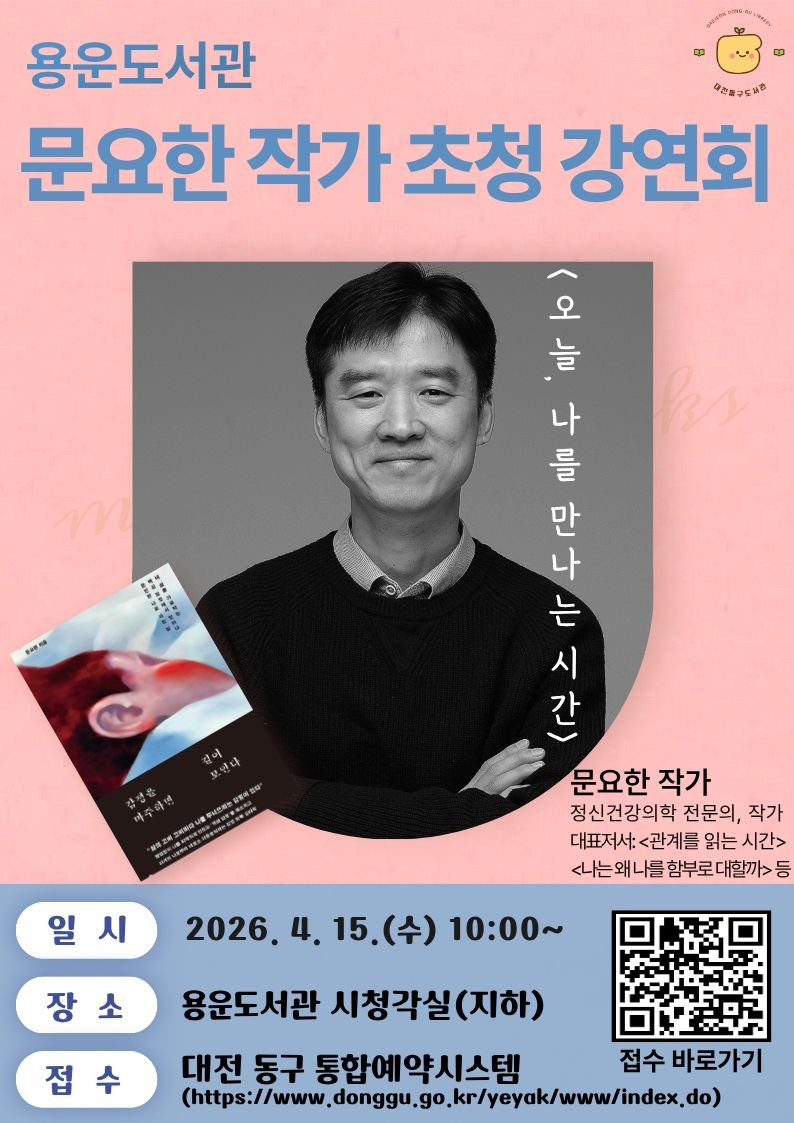 이번 강연은 오는 4월 15일 오전 10시 용운도서관 시청각실에서 열리며 '오늘, 나를 만나는 시간'을 주제로 감정의 본질과 기능, 회복 방법 등을 다룰 예정이다.