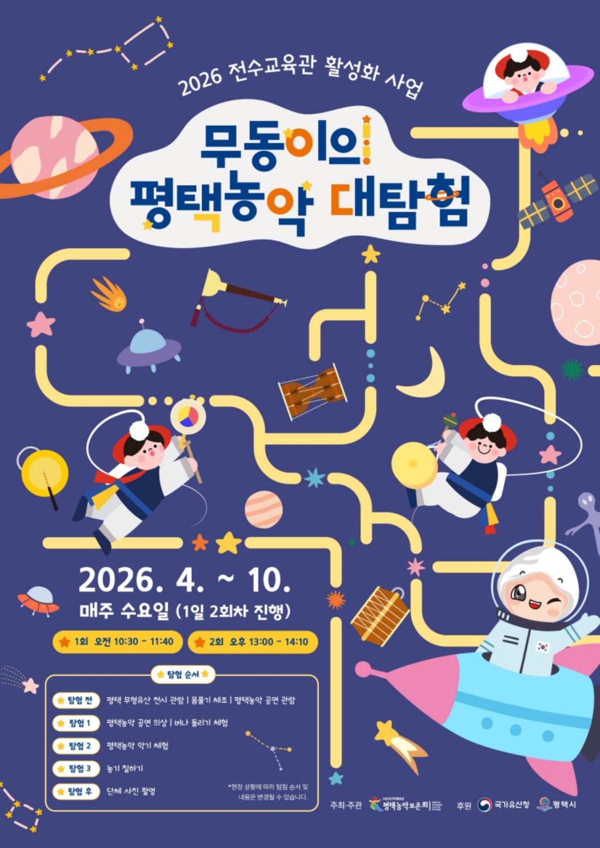 [충청뉴스큐] 평택시는 오는 4월 29일부터 10월 28일까지 2026년 전수교육관 활성화 지원사업 ‘무동이의 평택농악 대탐험’을 평택무형유산 전수교육관에서 매주 수요일 1일 2회차 총 38회를 운영한다고 밝혔다.