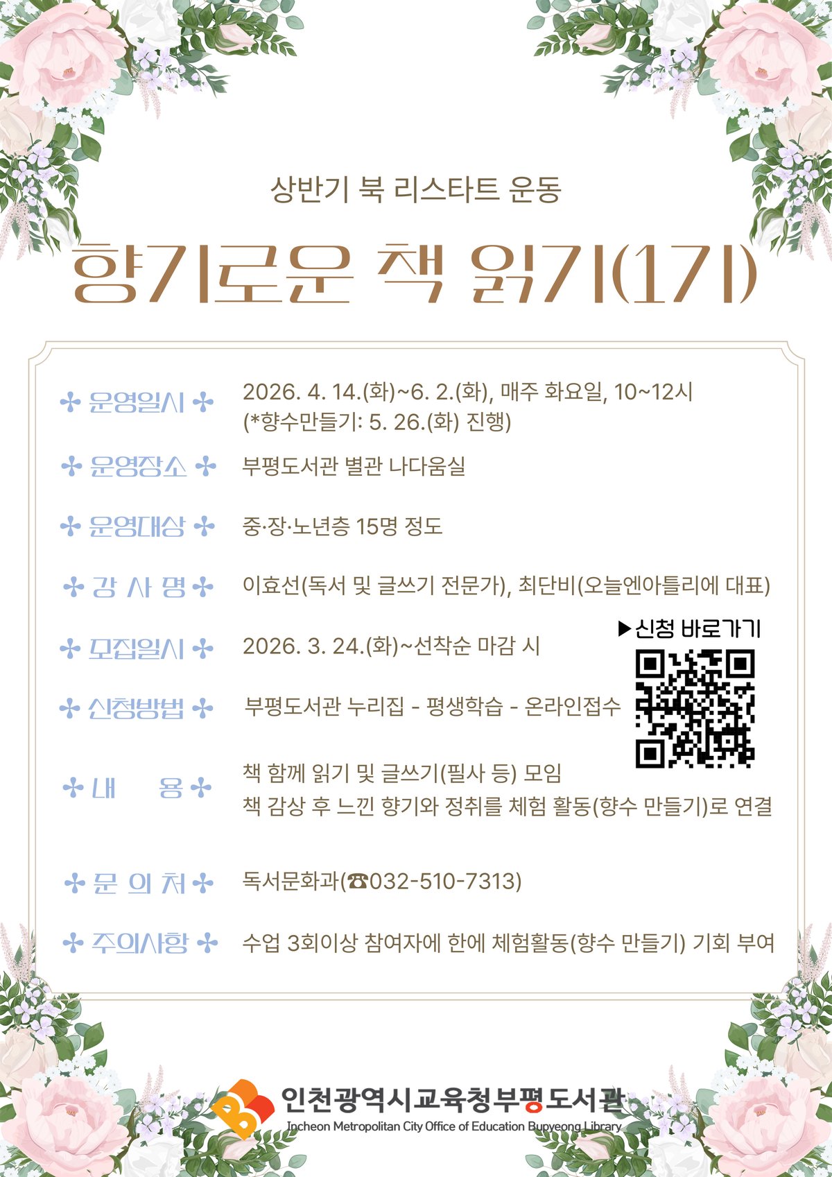 [충청뉴스큐] 인천광역시교육청부평도서관은 중 장 노년층의 활기찬 독서 생활을 지원하는 ‘북 리스타트 운동’의 일환으로 오는 24일부터 ‘향기로운 책 읽기’1기 참여자를 모집한다.