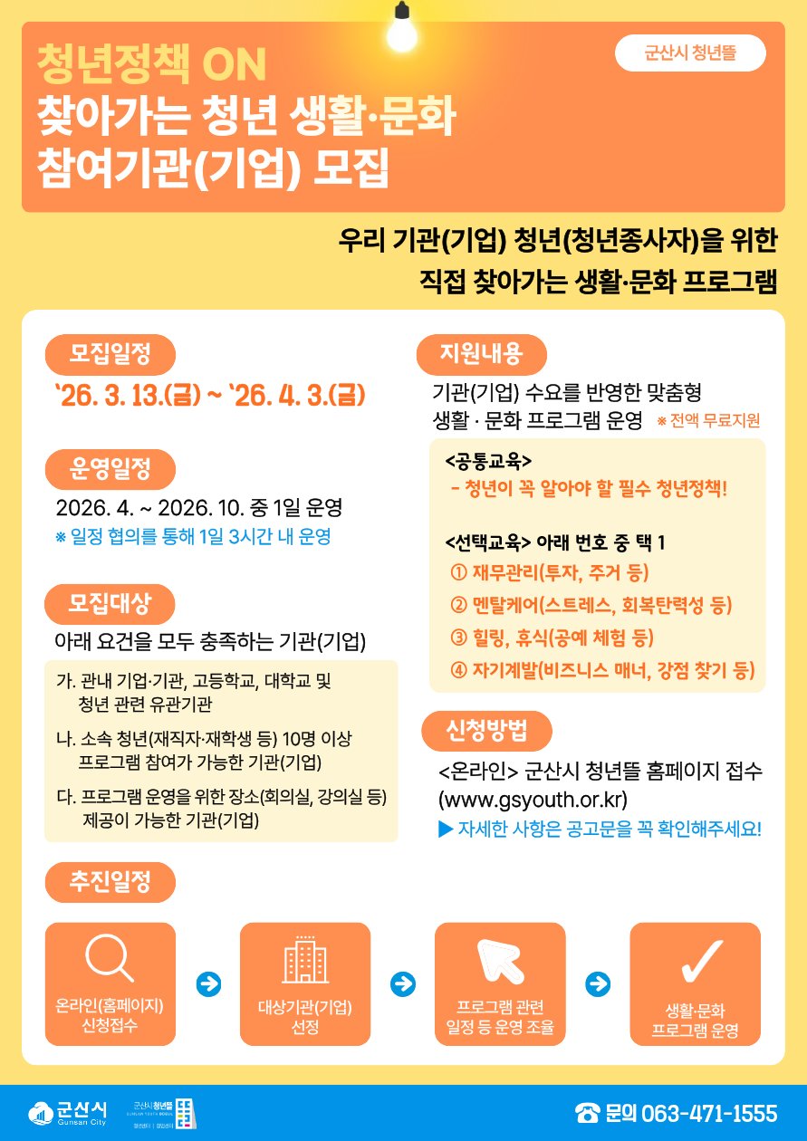 [충청뉴스큐] 군산시는 청년의 일 생활 균형을 지원하고 현장 중심의 정책 체감을 높이기 위해 ‘청년정책 ON: 찾아가는 청년 생활 문화’ 프로그램에 참여할 기관을 4월 3일까지 모집 중이라고 밝혔다.
