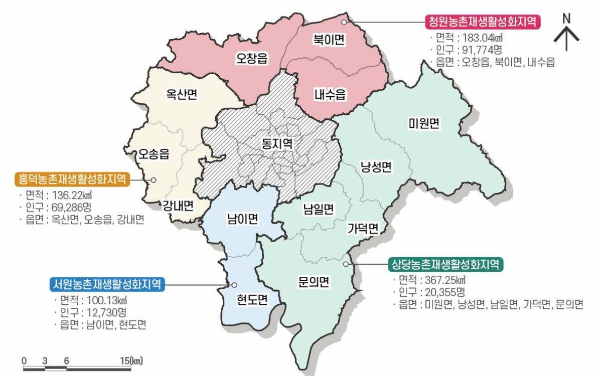 시는 국비 126억원을 포함한 총사업비 180억원을 투입해 미원면 어울림거점센터와 문의면 대청다락행복센터 조성 사업을 추진하고 있으며 가덕면 남일면 낭성면 배후마을과 연계한 프로그램 운영을 위한 상당생활권 기본계획 수립을 완료했다.
