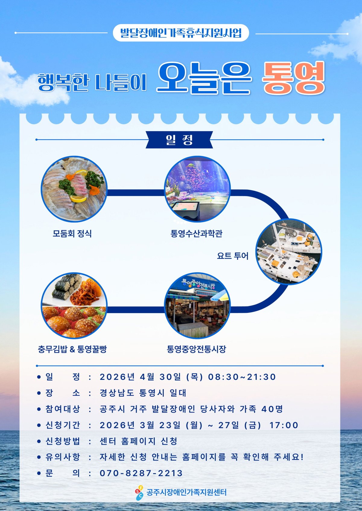 [충청뉴스큐] 공주시장애인가족지원센터는 공주시에 거주하는 발달장애인 가족을 대상으로 가족휴식지원사업 ‘행복한 나들이, 오늘은 통영’을 오는 4월 30일에 진행한다고 밝혔다.