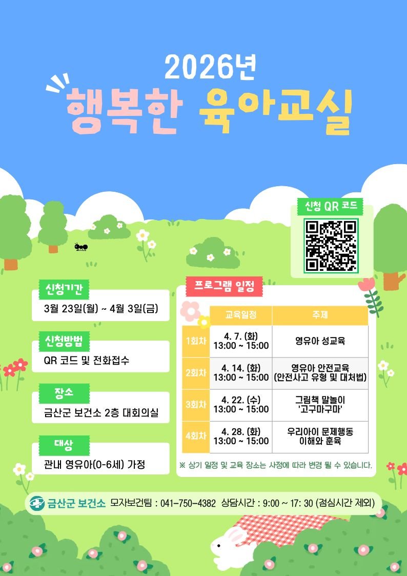 [충청뉴스큐] 금산군보건소는 관내 예비 부모 및 6세 이하 자녀를 둔 부모를 대상으로 4월 7일부터 28일까지 행복한 육아교실을 개최한다.