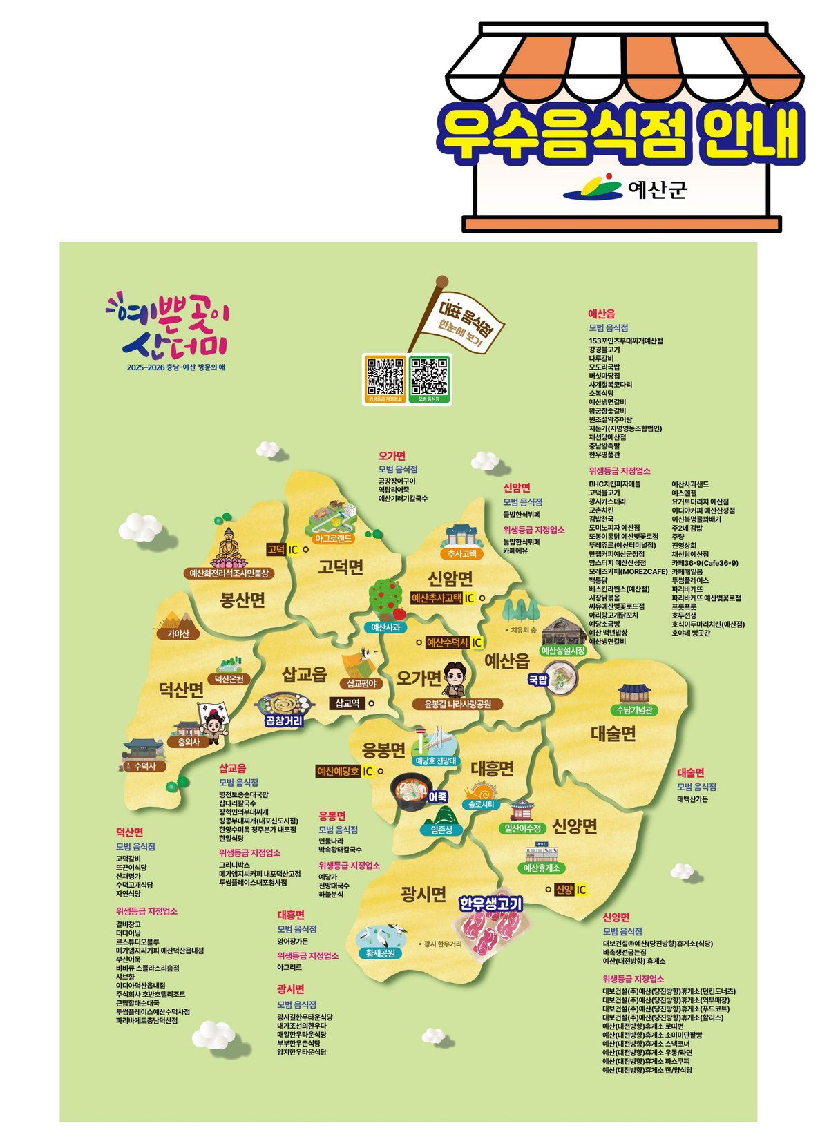 [충청뉴스큐] 예산군은 예산을 방문하는 관광객과 군민이 안심하고 음식점을 이용할 수 있도록 주요 관광지에 우수음식점 안내판을 설치했다고 밝혔다.