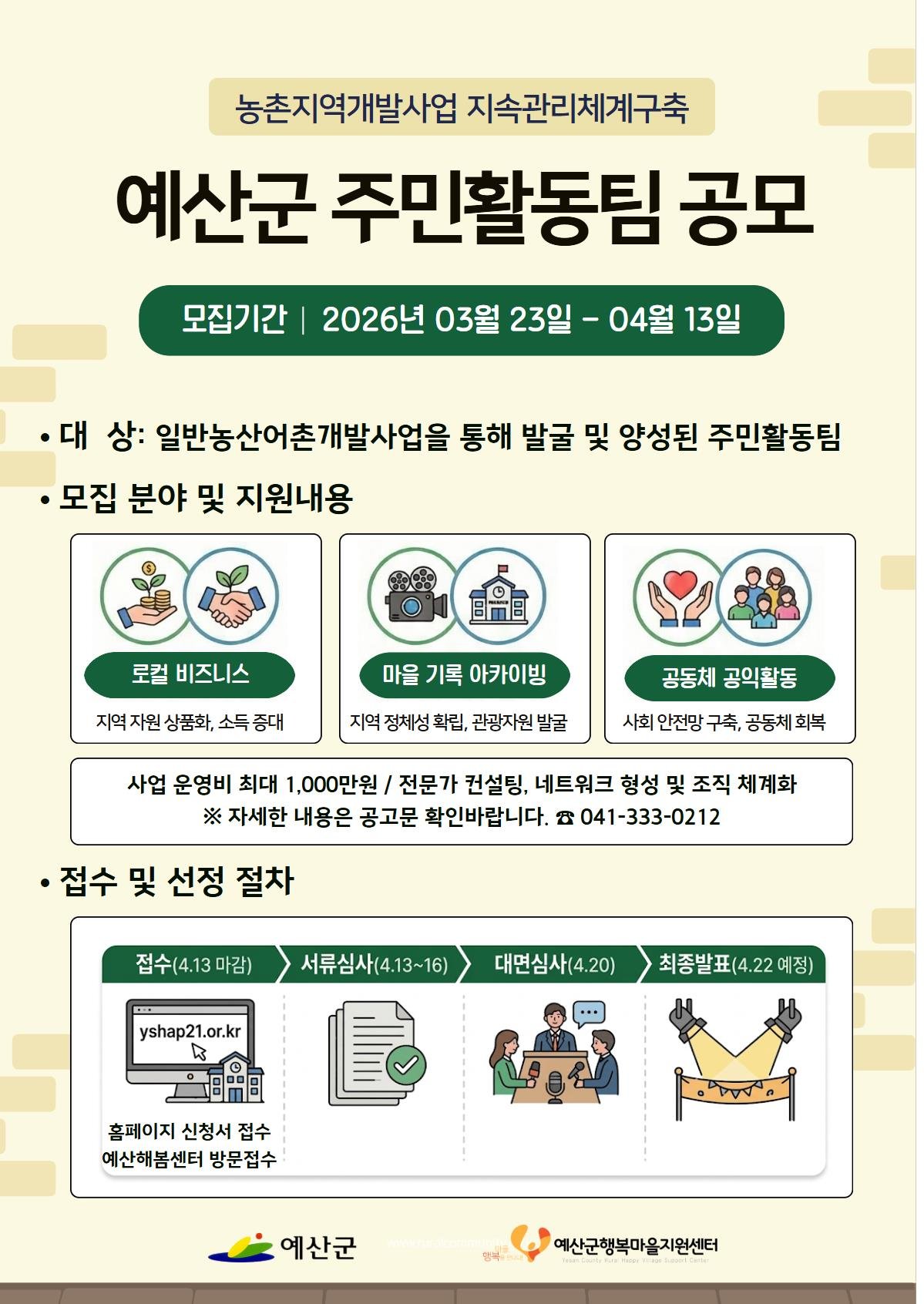 [충청뉴스큐] 예산군행복마을지원센터는 주민의 지역개발사업 참여를 확대하고 주민활동팀의 자립체계 구축을 지원하기 위해 ‘농촌지역개발사업 지속관리체계 구축’ 주민활동팀을 4월 13일까지 모집한다고 밝혔다.