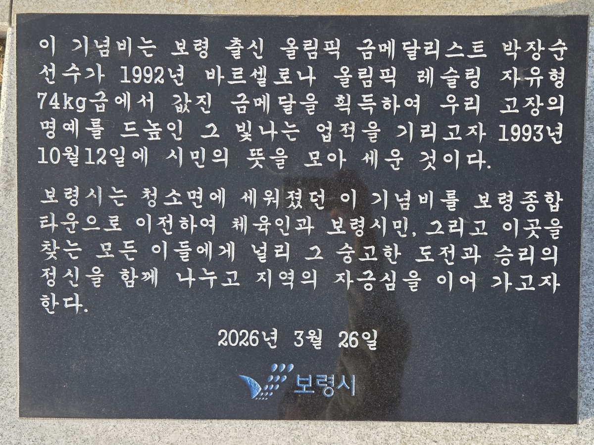 [충청뉴스큐] 보령시는 보령 출신 올림픽 금메달리스트 박장순 감독의 빛나는 업적을 기리고 시민의 자긍심을 고취하기 위해 추진한 ‘박장순 기념비 이전 사업’을 마무리하고 26일 박장순 기념비 이전 제막식을 개최했다.