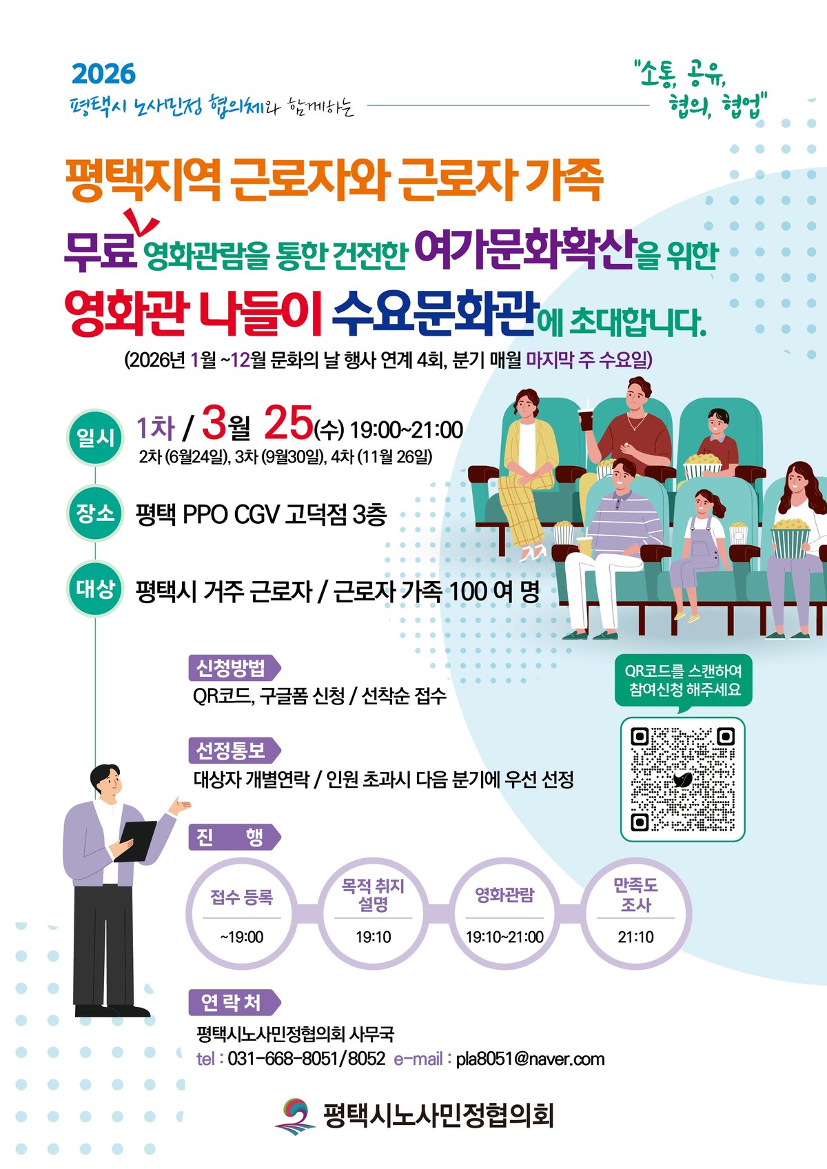 [충청뉴스큐] 평택시노사민정협의회가 지난 25일 평택 고덕CGV에서 평택지역 근로자와 근로자 가족을 위한 영화관 나들이 프로그램인 ‘수요문화관’을 개최했다.
