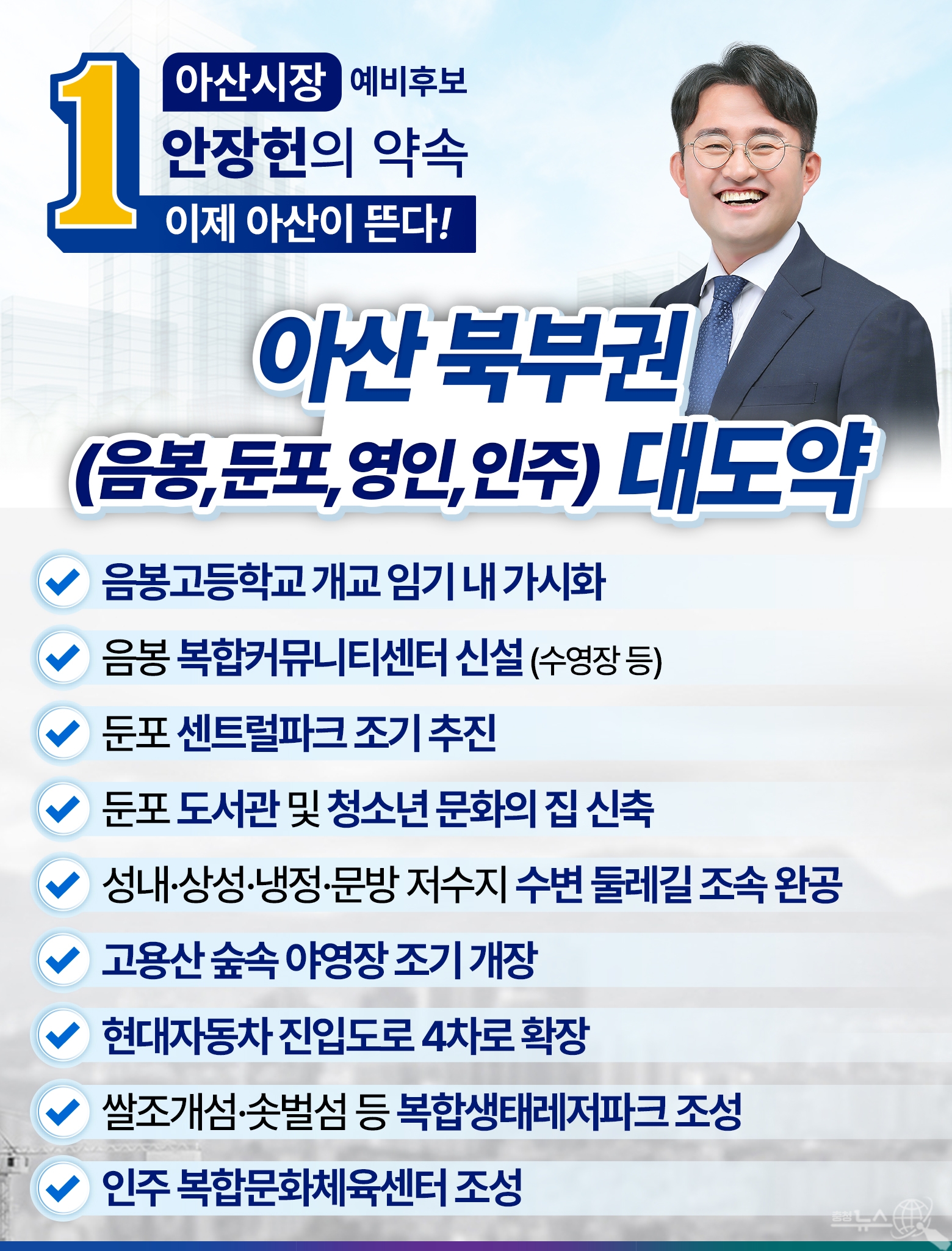 안장헌 아산시장 예비후보가 26일, 아산의 북부 거점 지역인 음봉·둔포·영인·인주면을 아산의 미래 성장 동력으로 육성하기 위한 ‘북부권 대도약 맞춤형 공약’을 발표했다.