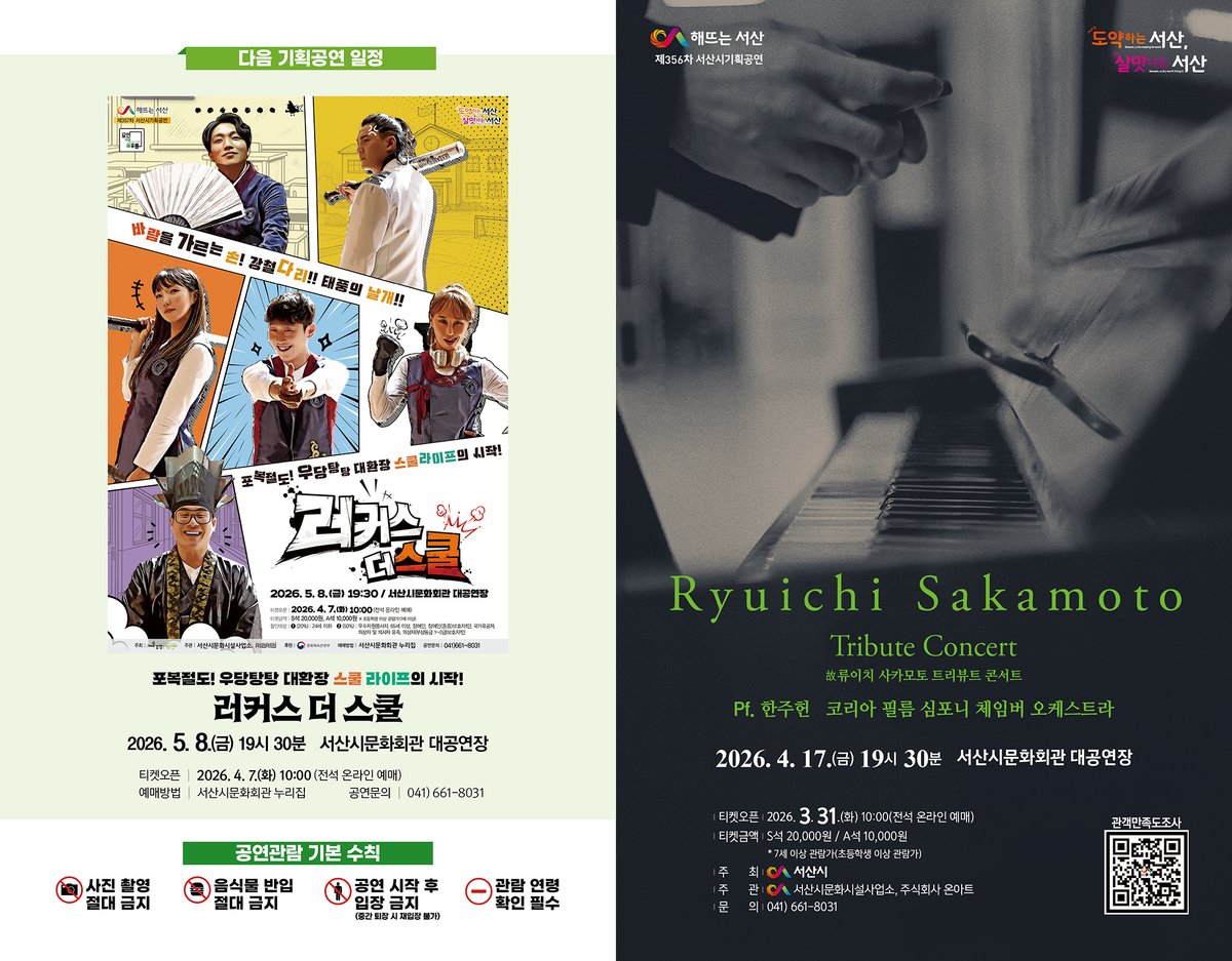 정동호 서산시 문화시설사업소장은 "이번 트리뷰트 콘서트는 류이치 사카모토의 음악을 사랑해 온 시민들에게 깊은 위로와 감동을 전하는 시간이 될 것"이라며 "앞으로도 세계적 예술가의 작품을 조명하는 수준 높은 기획공연을 지속적으로 선보이겠다"라고 밝혔다.