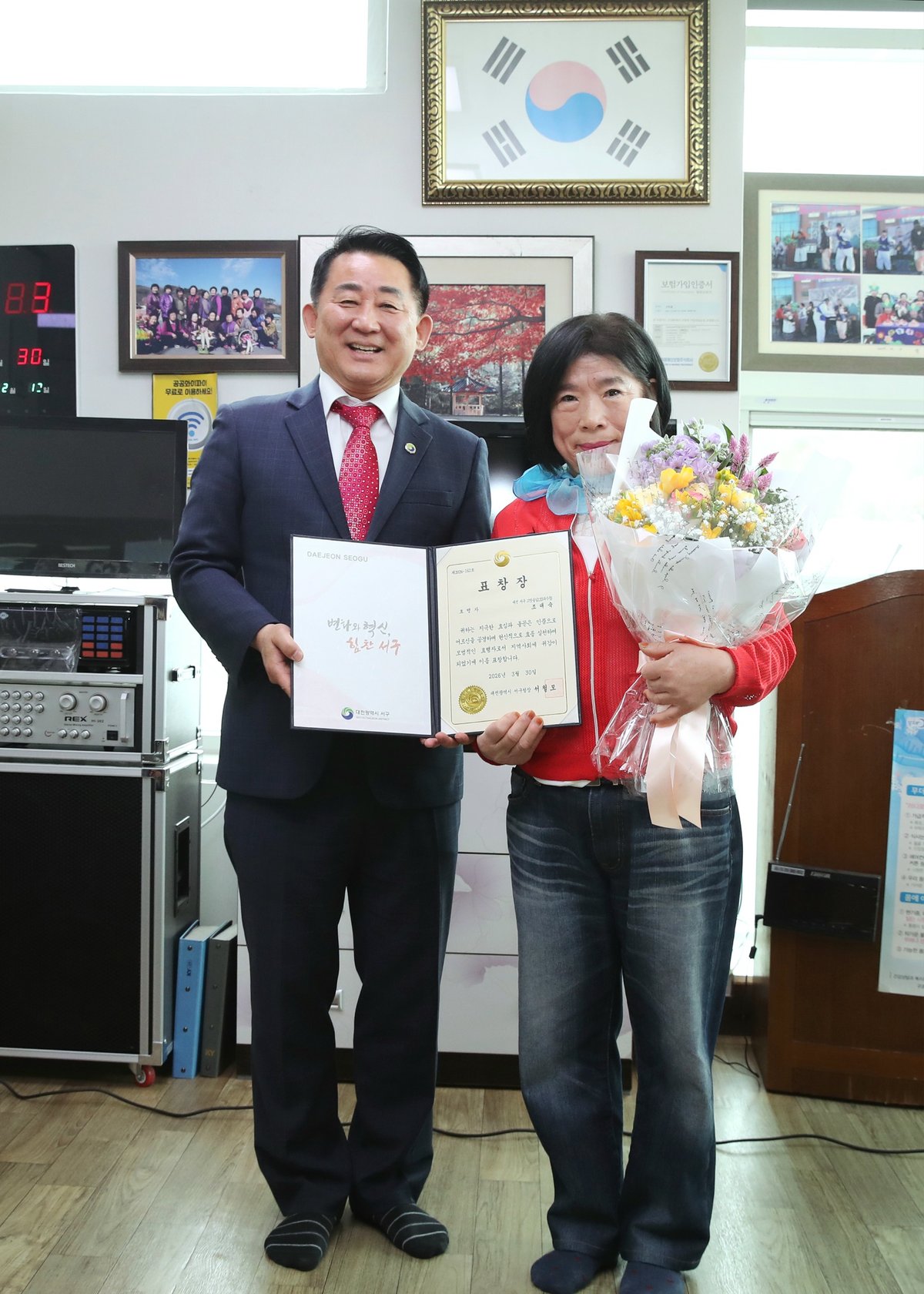 [충청뉴스큐] 대전 서구 가수원동 행정복지센터는 30일 괴곡경로당에서 지역사회에 귀감이 되는 효행자를 격려하기 위한 ‘노인복지 유공 표창’행사를 개최했다.