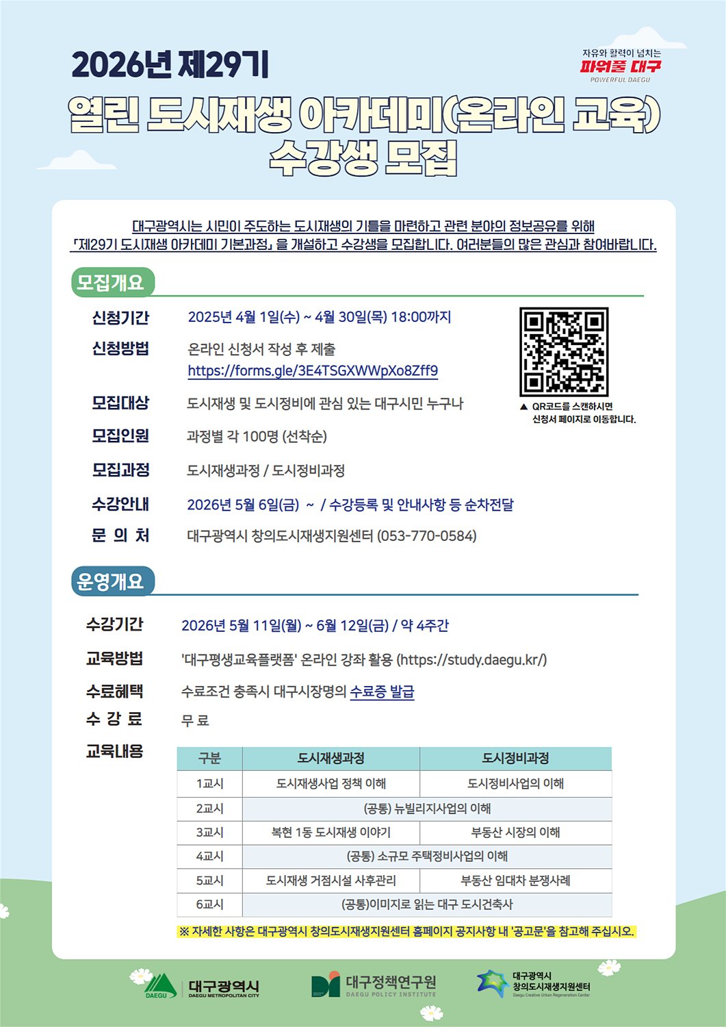 [충청뉴스큐] 대구광역시는 도시재생과 정비 사업에 대한 시민들의 올바른 이해와 역량 강화를 위해 ‘제29기 열린 도시재생 아카데미 기본과정’ 수강생을 모집한다.