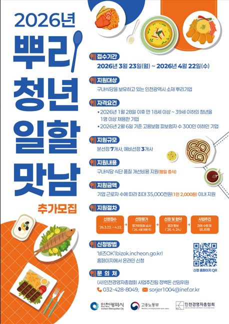 뿌리청년 일할맛남: 구내식당을 보유한 인천 소재 뿌리기업에 근로자 1인당 최대 2000원의 식단 개선비를 지원한다.