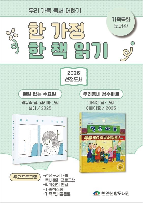 올해의 ‘한 책’은 시민 투표와 가족으로 구성된한 책 선정단의 투표를 거쳐 곽윤숙 작가의 ‘별일 없는 수요일’, 이작은 작가의 ‘우리동네 청수마트’ 가 선정됐다.