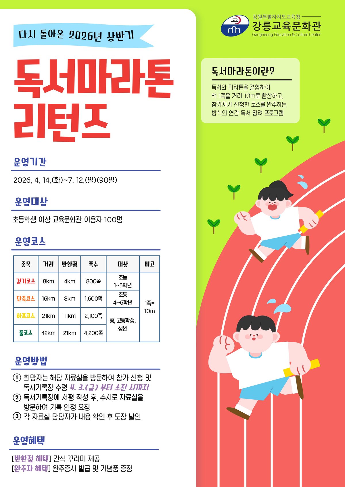 [충청뉴스큐] 강릉교육문화관은 지역 내 책 읽는 문화 확산을 위해 4월부터 12월까지 학생 및 성인을 대상으로 '2026년 독서마라톤 리턴즈'를 운영한다.
