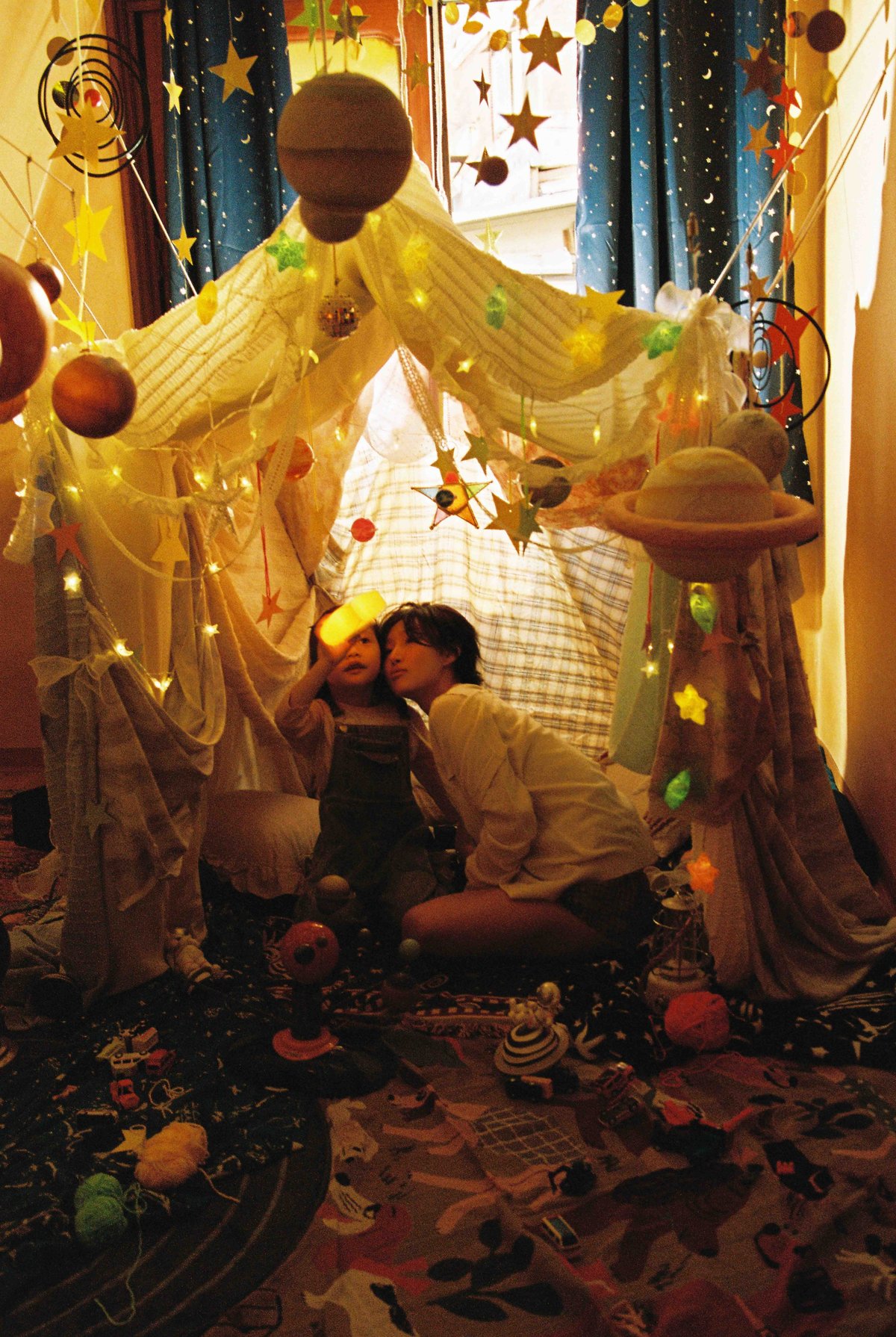 화사는 편안한 스타일링으로 내추럴한 매력을 발산했고 별과 행성 모양 모빌이 가득 채워진 공간이 우주를 연상케 하며 몽환적인 분위기를 극대화했다.