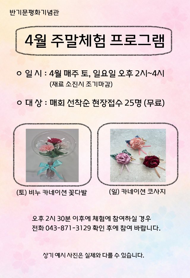 [충청뉴스큐] 음성군 제8대 유엔사무총장 반기문 평화기념관에서는 관람객을 위한 4월 주말 무료 체험 프로그램을 운영한다.
