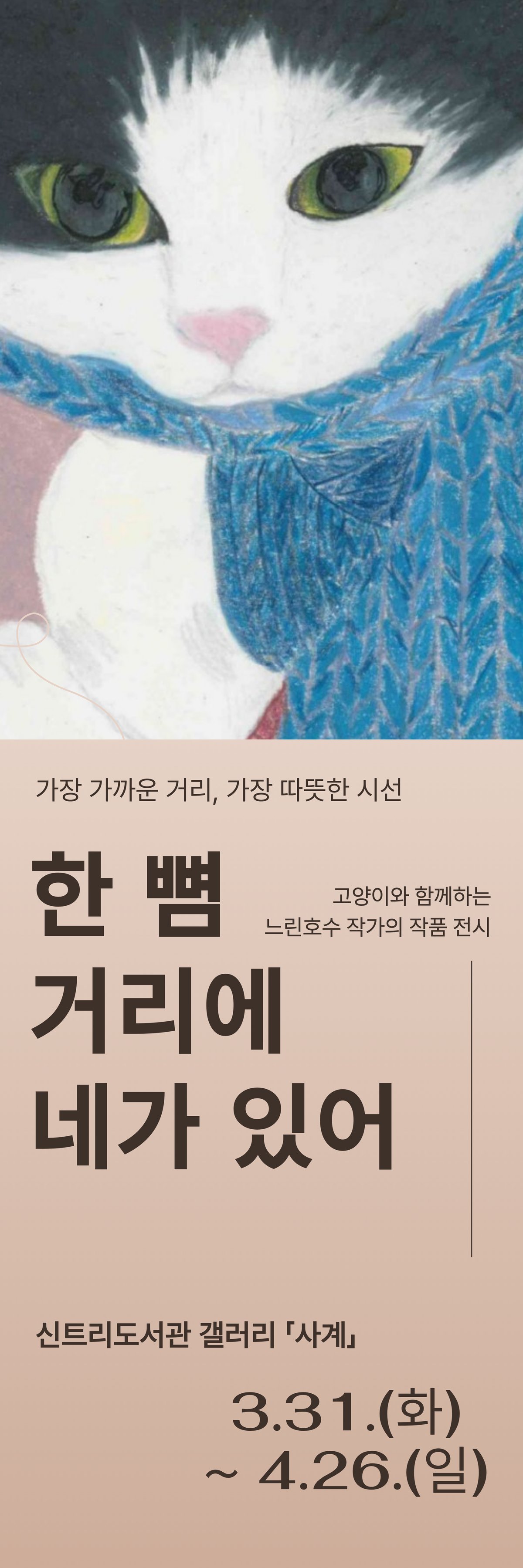 이번 전시는 ‘가장 가까운 거리, 가장 따뜻한 시선’ 이라는 주제로 반려 고양이와 함께하는 소중한 일상의 순간들을 선보인다 전시에서는한 뼘 거리에 네가 있어를 비롯해 엄마 손이 좋아, 외계고양이와 지구고양이 등 주요 작품을 선보이며 작가는 일상의 찰나를 포착한 다정하고 포근한 화풍으로 관람객들에게 따뜻한 위로와 공감을 전할 예정이다.