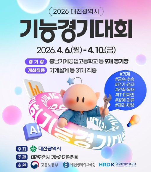 [충청뉴스큐] 대전시는 지역 숙련기술인들의 축제인 ‘2026년 대전광역시 기능경기대회’ 가 4월 6일부터 10일까지 5일간 충남기계공업고등학교 등 9개 경기장에서 개최된다고 밝혔다.
