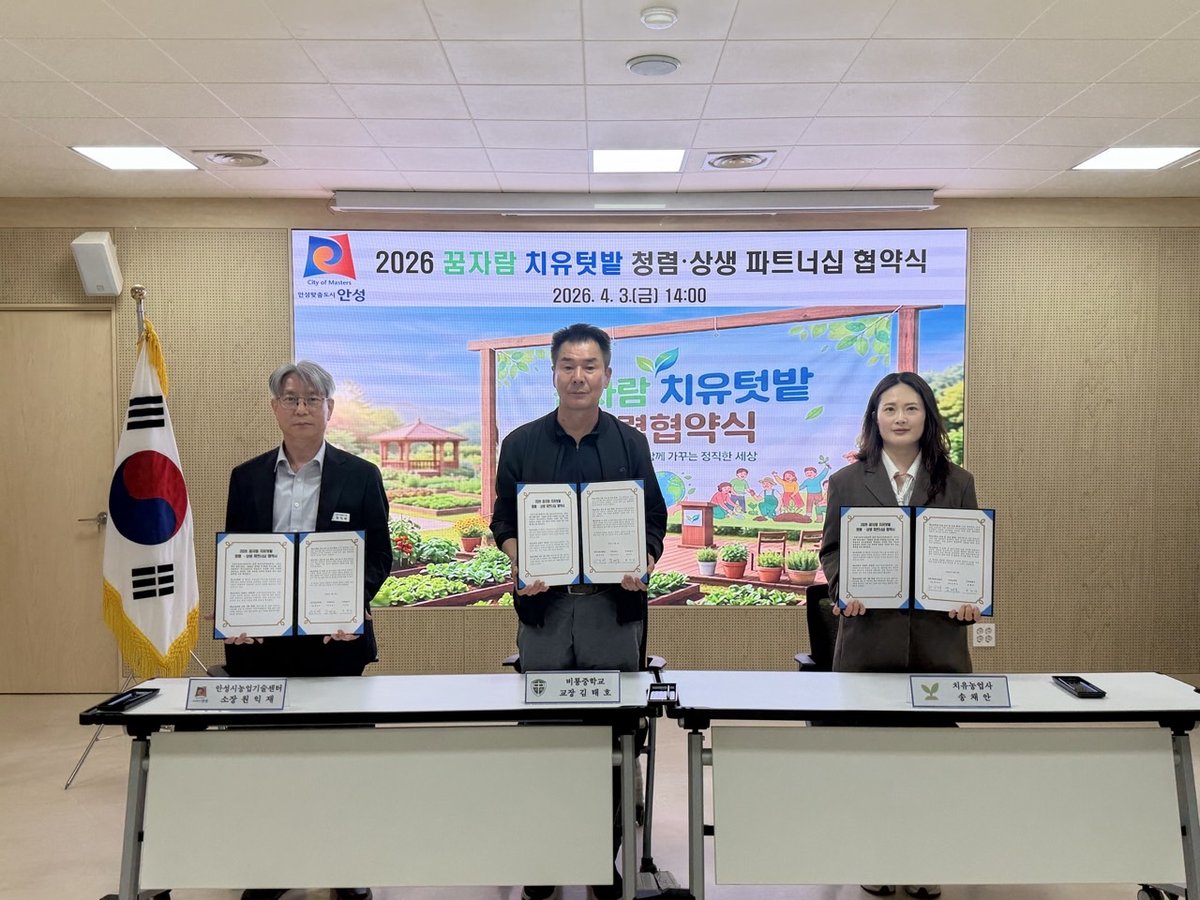 [충청뉴스큐] 안성시 농업기술센터는 지난 4월 3일 센터 내 생활과학관에서 비룡중학교 및 대표 치유농업사와 함께 2026 꿈자람 치유텃밭 청렴 상생 파트너십 협약 을 체결했다.