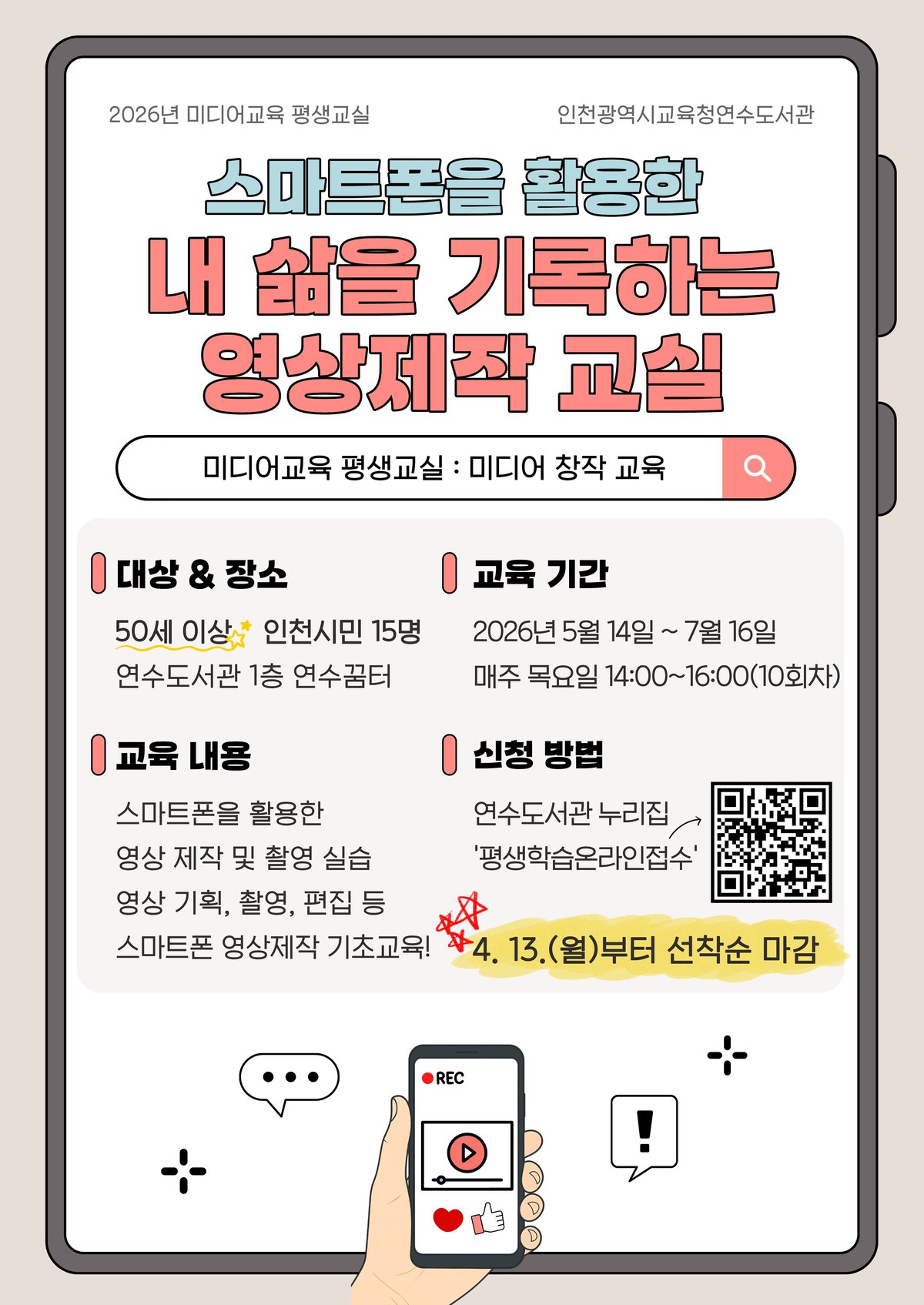 [충청뉴스큐] 인천광역시교육청연수도서관은 시민들의 미디어 창작 활동 지원을 위해 2026년 미디어교육 평생교실 ‘내 삶을 기록하는 영상제작 교실’을 운영한다.