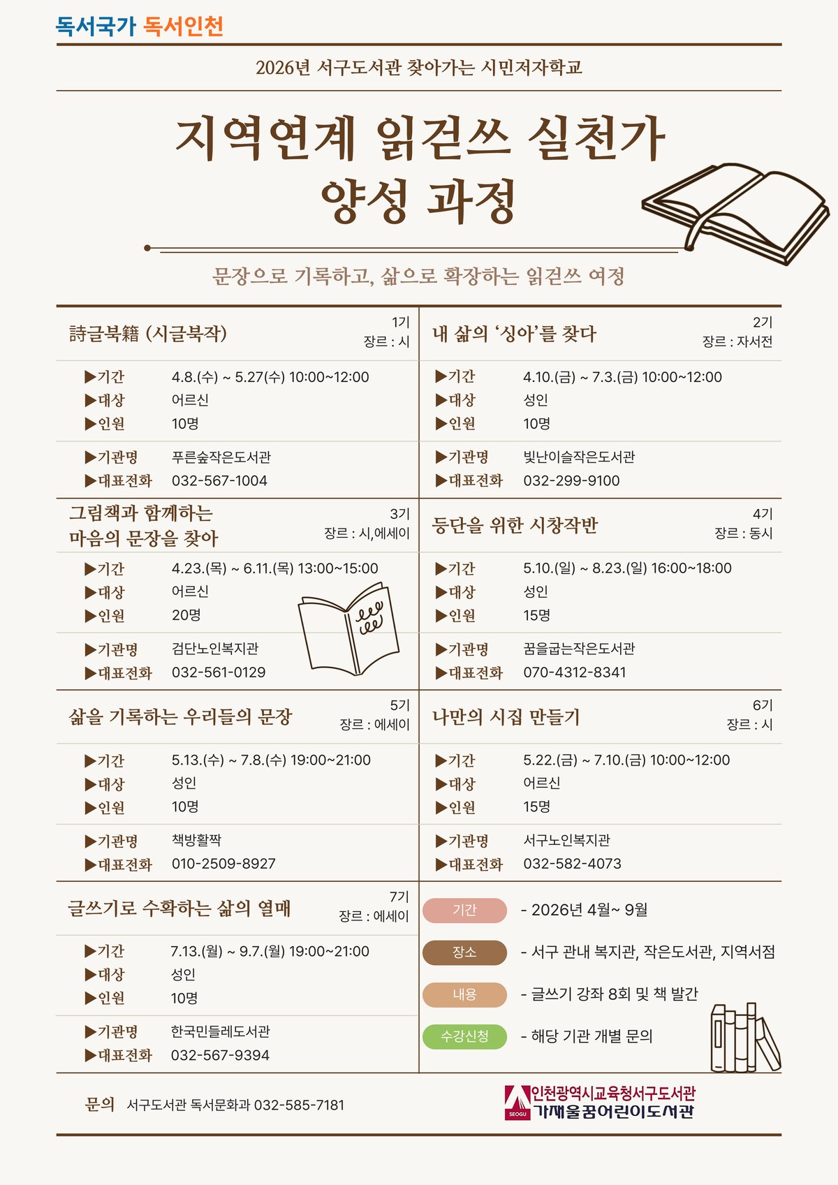 서구도서관 관계자는 “이번 지역기관 연계 사업을 통해 ‘독서국가, 독서인천’ 실현의 기반이 되어 시민의 독서활동을 생활화하고 지역사회 중심의 지속 가능한 독서공동체 형성에 기여하길 기대한다”고 말했다.