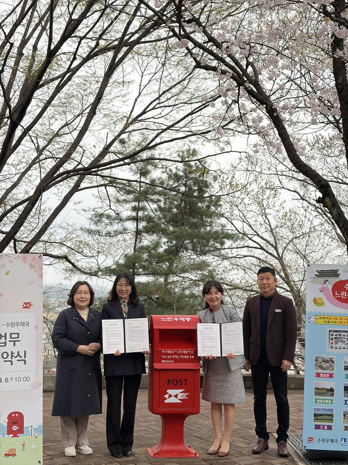 수원시와 수원우체국은 6일 팔달산 회주도로 내 남포루 앞에서 ‘느린우체통 설치 운영을 위한 업무협약’을 체결했다.