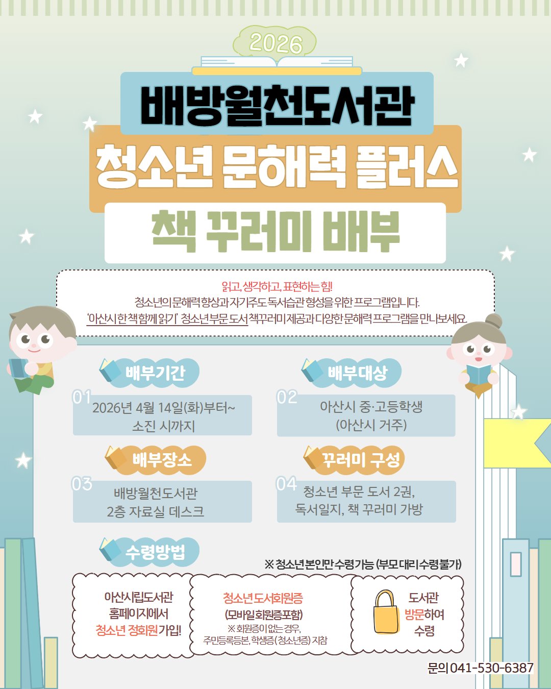 책 배부는 선착순 신청으로 아산시에 거주하는 중 고등학생을 대상으로 하며 수령은 배방월천도서관 2층 자료실 데스크에서 청소년 본인에 한해 가능하다.