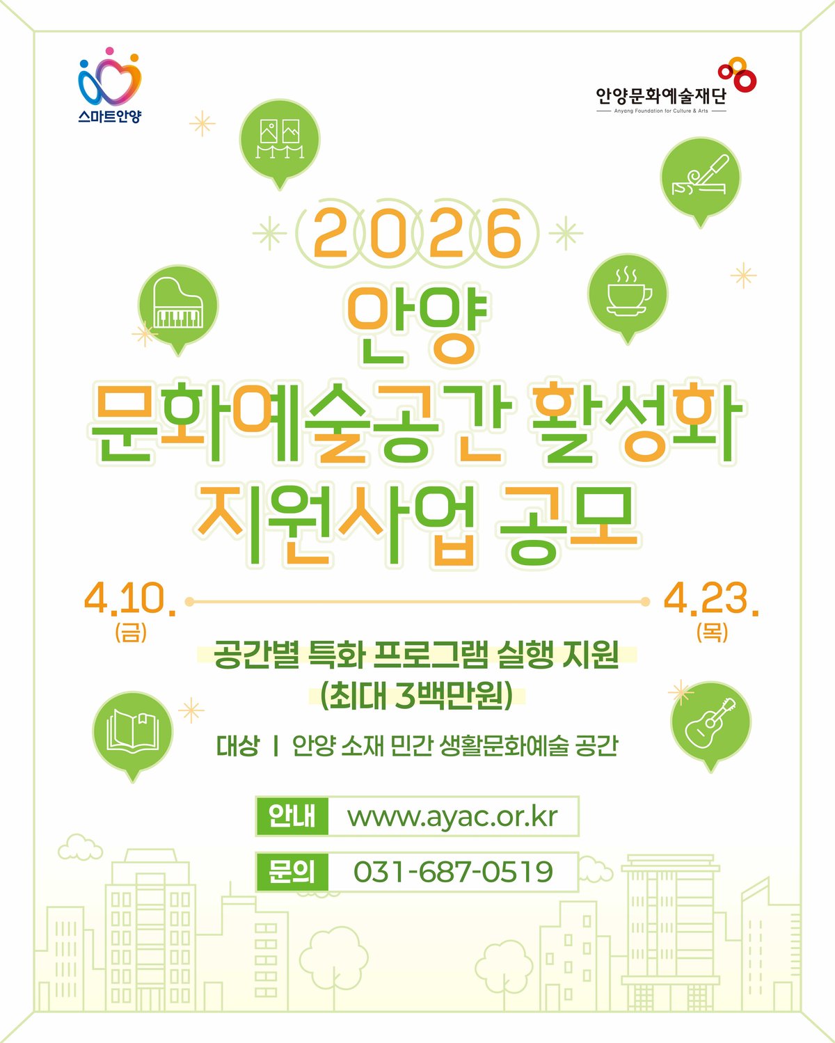 홍보담당 정책기획부 주임 강미정 031-687-0522 총매수 총2쪽 첨부파일 사업담당 예술지원부 차장 박은수 031-687-0519 안양문화예술재단, ‘2026 안양 문화예술공간 활성화 지원사업’ 공모 민간 생활문화예술 공간 발굴 육성 및 시민 지역예술인 참여형 프로그램 지원 공간별 최대 300만원 지원, 정산 간소화 및 지역 예술인 참여 사업 우대 안양문화예술재단은 지역 내 민간 생활문화예술 공간의 자립 기반을 강화하고 문화시민을 육성하기 위한 2026 문화예술공간 활성화 지원사업 참여 공간을 공개 모집한다고 8일 밝혔다.