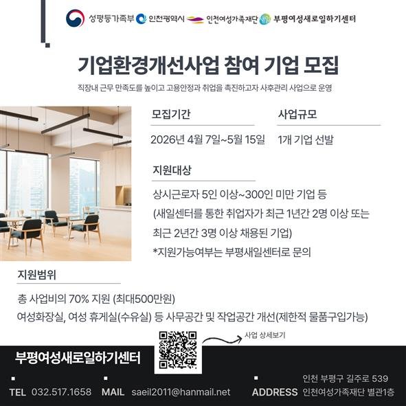 [충청뉴스큐] 부평여성새로일하기센터는 여성친화적 근무환경 조성과 경력보유여성의 안정적인 고용 확대를 위해 2026년 기업환경개선사업 참여기업을 모집한다고 밝혔다.