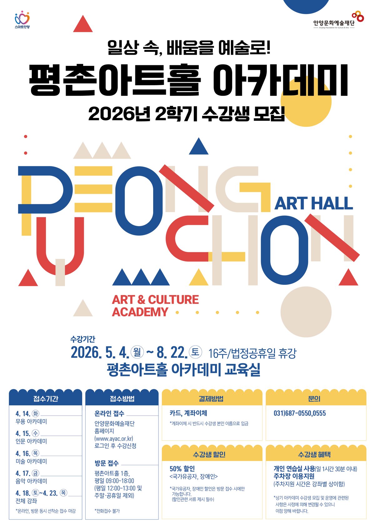 홍보담당 정책기획부 주임 강미정 031-687-0522 총매수 총2쪽 첨부파일 사업담당 예술지원부 과장 남민영 031-687-0517 안양문화예술재단, 2026 평촌아트홀 2학기 아카데미 수강생 모집 일상 속 배움을 예술로 시민 참여형 문화예술 교육 운영 인문 음악 무용 미술 분야 총 29개 강좌 개설 안양문화예술재단은 시민 누구나 문화예술을 자유롭게 접하고 즐겁게 배울 수 있도록 오는 4월 14일부터 23일까지 ‘2026년 평촌아트홀 아카데미’ 2학기 수강생을 모집한다.